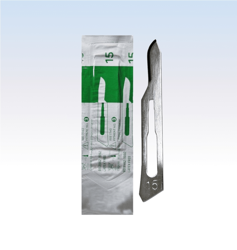 Descrição: A lâmina de bisturi é confeccionada em aço carbono, projetada para realizar o encaixe com os cabos de bisturi. Cada lâmina é embalada individualmente em um pacote de folha de alumínio prevenindo o contato com as bordas afiadas, o que protege contra oxidação, mantendo a integridade da lâmina e facilitando seu o manuseio.