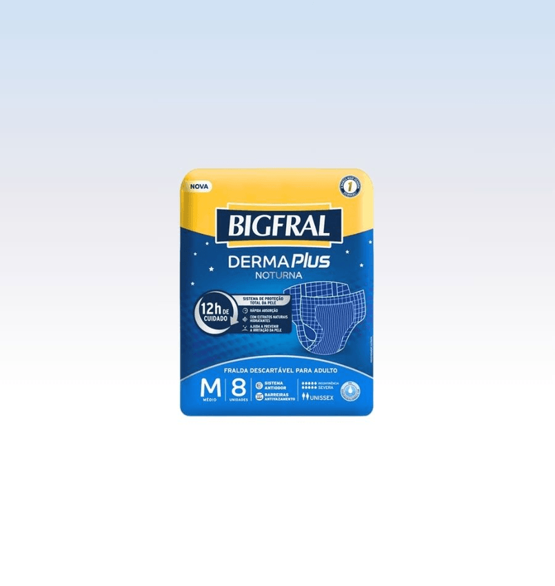 Descrição: A Bigfral Noturna foi desenvolvida para adultos com incontinência urinária severa. Possui o exclusivo sistema de proteção total da pele, com extratos naturais hidratantes que ajudam a prevenir irritações, mantendo a pele protegida e saudável, além de sistema antiodor, trazendo até 10h de proteção e cuidado.
