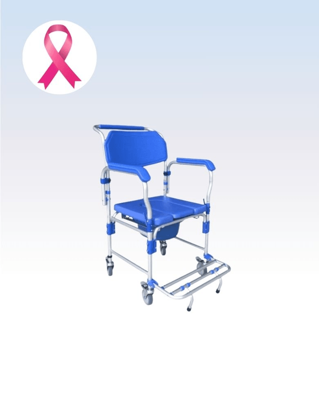 que facilita a higienização do usuário sentado. A cadeira possui 4 rodas com
